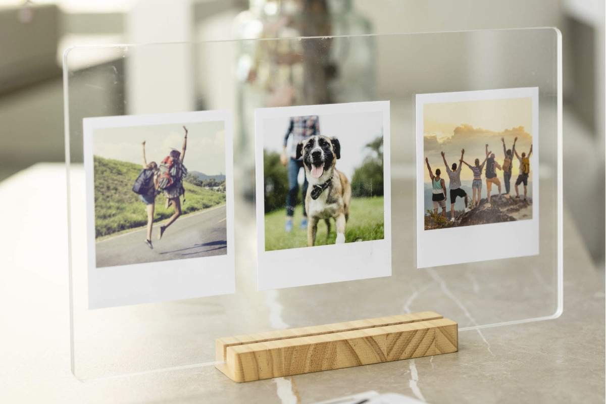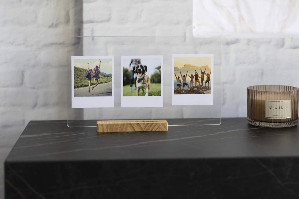 En Hispaprint, lanzamos un nuevo producto hecho con dos piezas de metacrilato transparente de 4mm cada una acompañadas de una base de madera de pino de 18mm. Es ideal para decorar tu hogar añadiendo tus fotos favoritas e intercambiarlas cuando quieras o incluso para poner la carta de tu restaurante o poner las flores preservadas que más te gusten.
